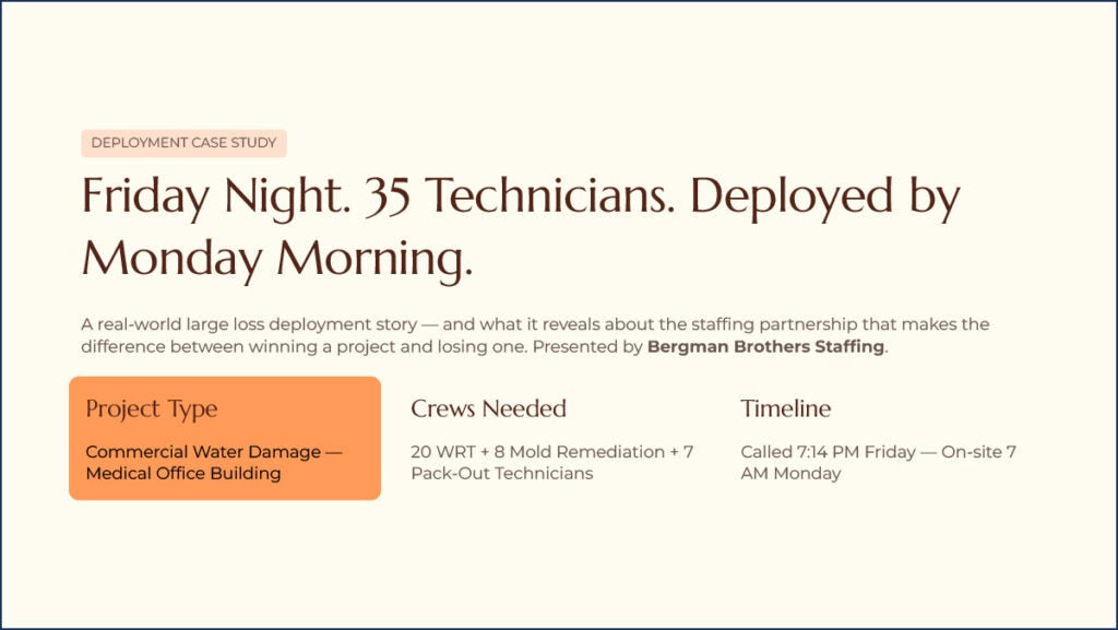 At 7:14 PM on a Friday, a restoration contractor with three active crews received an emergency call. A burst pipe had flooded two floors of a medical office building. Insurance was involved. Monday morning was the deadline.